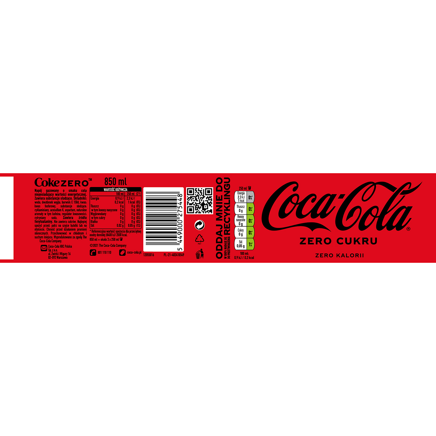 Coca-Cola Zero 850ml w butelce PET to napój, który łączy w sobie doskonały smak z brakiem cukru i zerową kalorycznością. Doskonale sprawdzi się jako element diety niskokalorycznej lub dla osób dbających o linię.