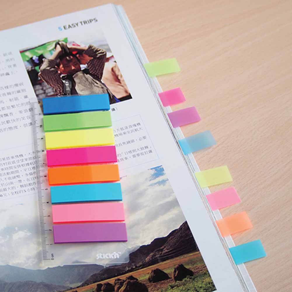 Neonowe kolory zakładek dodają energii i ułatwiają kategoryzowanie oraz segregowanie notatek, co znacznie poprawia organizację pracy. Zakładki są półprzezroczyste, dzięki czemu nie zasłaniają tekstu, a jednocześnie wyraźnie go podkreślają.