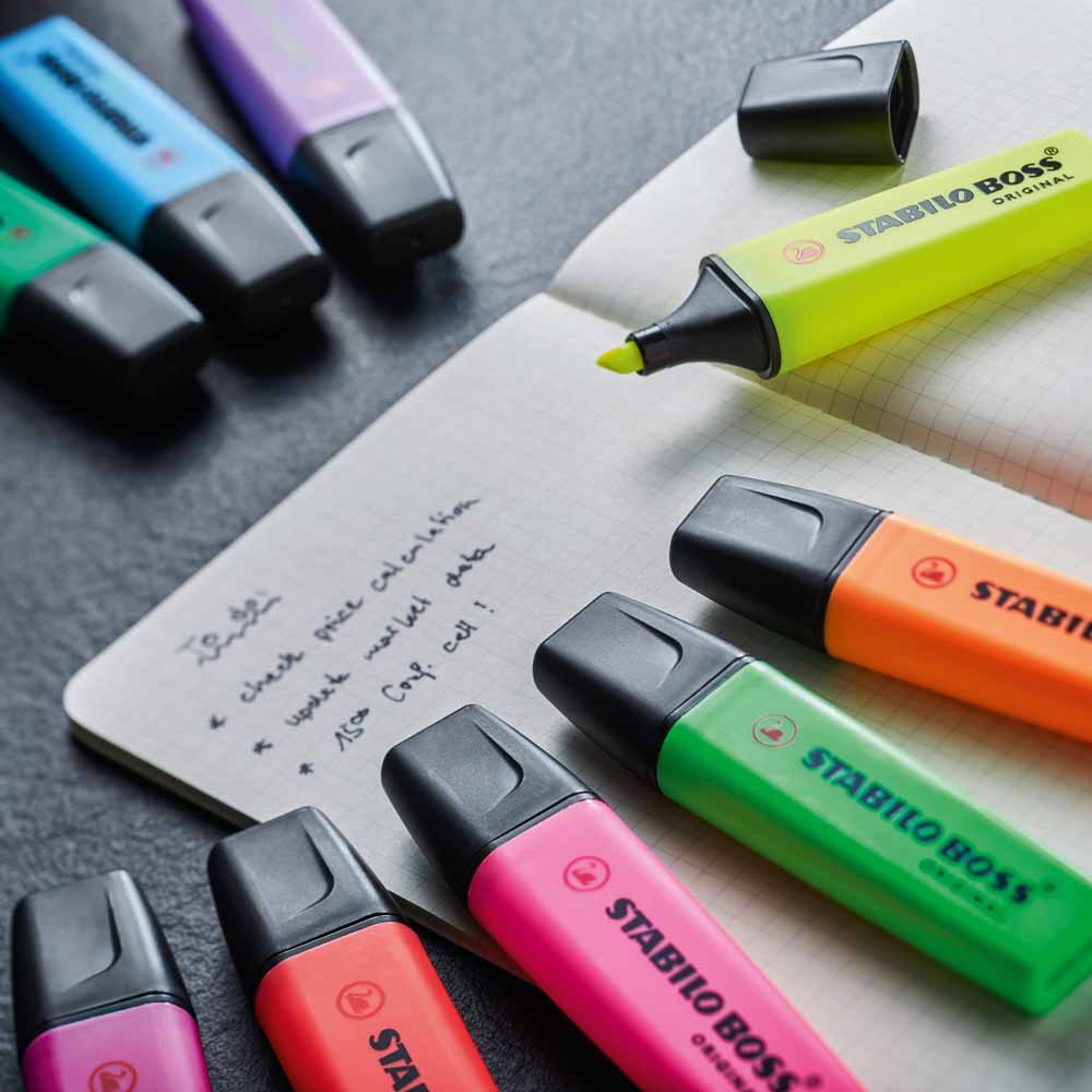 STABILO BOSS ORIGINAL dba o środowisko - wszystkie czarne elementy zakreślaczy wykonane są z plastiku pochodzącego z recyklingu. Zakreślacze są również łatwe do ponownego napełnienia, co redukuje ilość odpadów.
