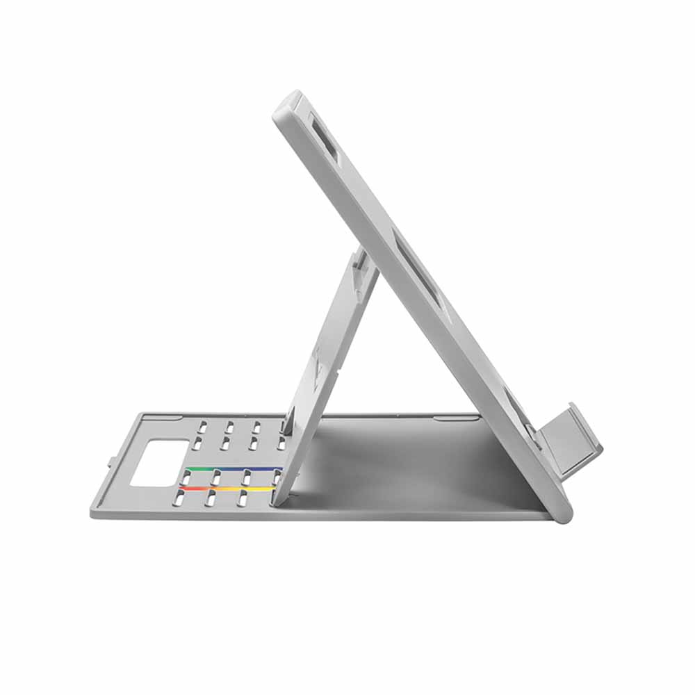 - elegancka konstrukcja "2 w 1" umożliwia regulację wysokości i nachylenia, wpływając na poprawę postawy, prawidłowy kąt patrzenia na ekran, wygodę szyi i ramion, utrzymując jednocześnie odpowiednie chłodzenie wnętrza laptopa lub tabletu