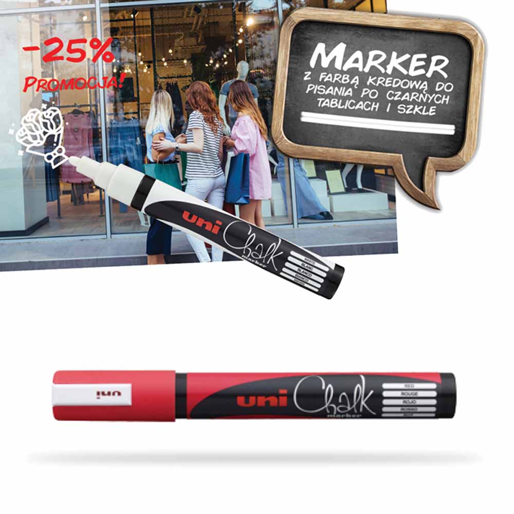Marker UNI PWE5M oferuje grubość linii pisania od 1,8 do 2,5 mm, co zapewnia wyraźne i czytelne oznaczenia. Idealny do tworzenia eleganckich napisów i rysunków na tablicach kredowych i szkle.