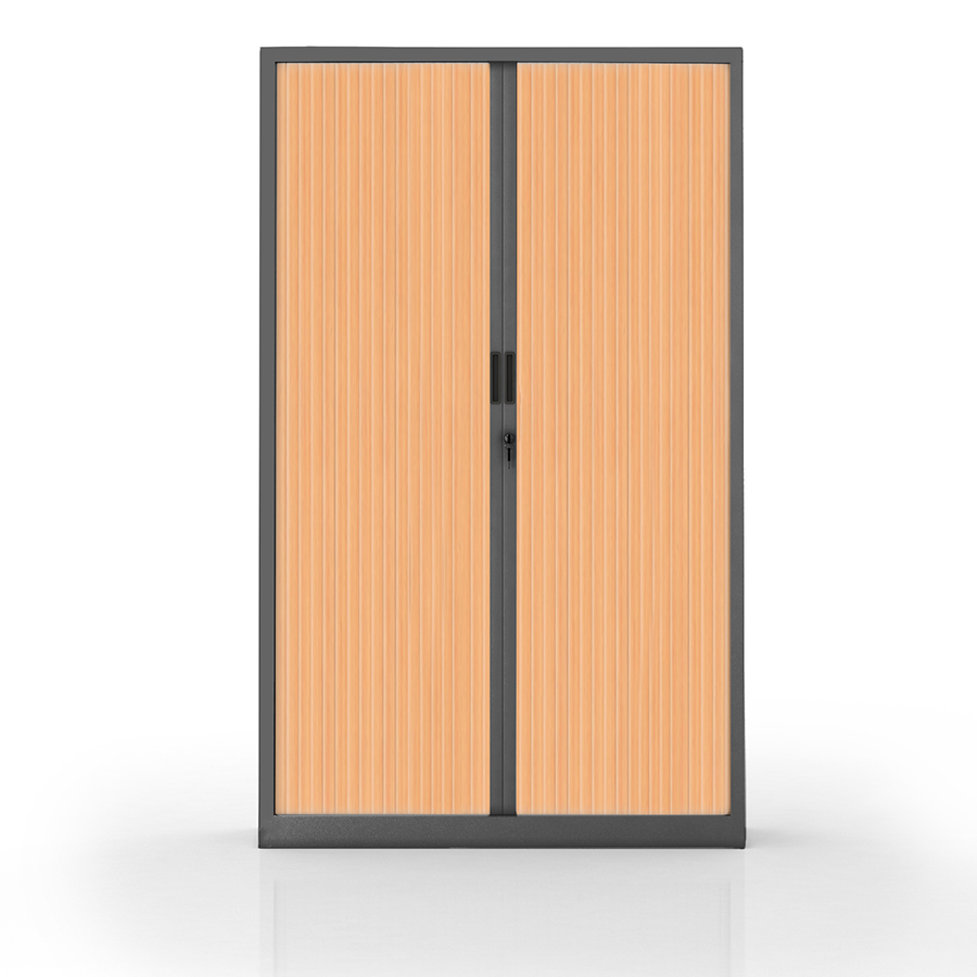 Szafa żaluzjowa aktowa Basycs. Drzwi żaluzjowe wykonane z polipropylenu, rozsuwane są poziomo obustronnie. Posiadają listwy metalowe zapobiegające włamaniom. Drzwi chowane się całkowicie wzdłuż bocznych ścian szafy, co zapewnia nieograniczony dostęp do wnętrza mebla. Drzwi żaluzjowe w szczególności sprawdzają się w pomieszczeniach, w których nie ma wystarczającej przestrzeni wokół szafy na otwieranie drzwi skrzydłowych. Zgrzewana konstrukcja szafy oraz zastosowanie blachy stalowej o grubości 0,8mm gwarantuje dużą stabilność. Szafa posiada zamek bębenkowy z zapasowym kluczykiem. Szafa malowana proszkowo, co stanowi optymalne zabezpieczenie przed korozją. Montaż półek za pomocą metalowych haczyków jest bardzo łatwy, w każdej chwili można zmienić jej wysokość. Możliwość regulacji wysokości półek co 25mm pozwala na dostosowanie szafy do indywidualnych potrzeb użytkownika. Półki można wykorzystać do przechowywania dokumentów w segregatorach jak i podwiesić od spodu wiszące akta. Szafy posiadają stopki do wyrównywania poziomu.