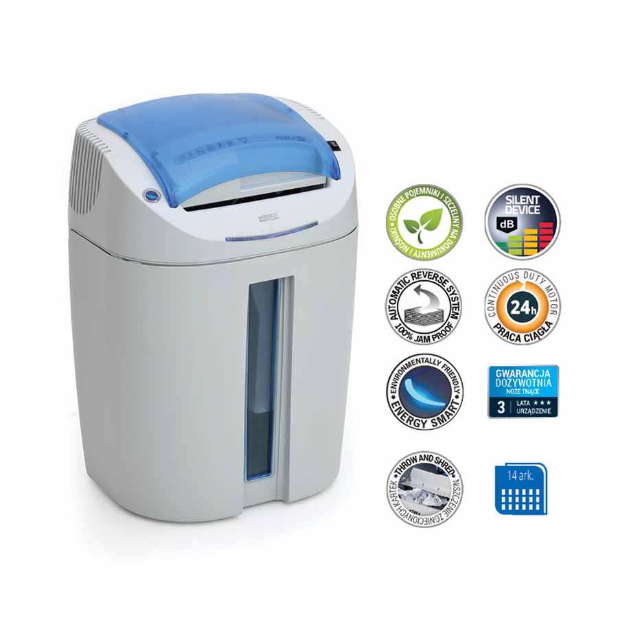 • automatyczne odcięcie zasilania w przypadku zaklinowania papieru lub wyjęciu pojemnika na ścinki
