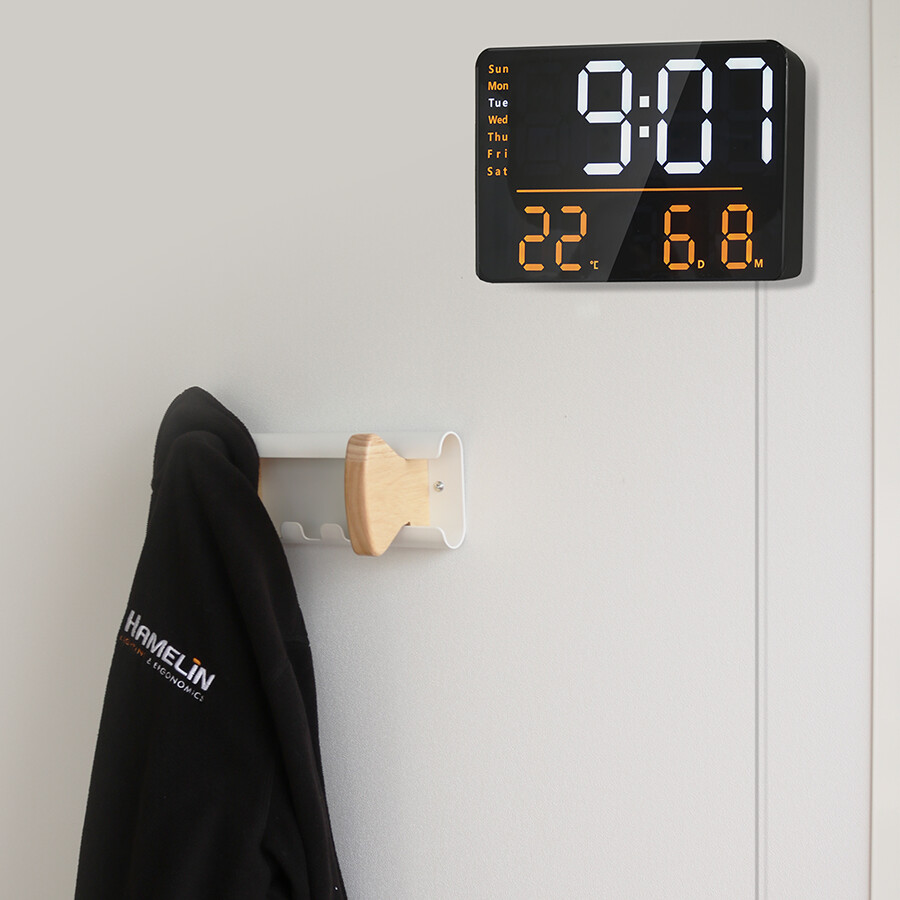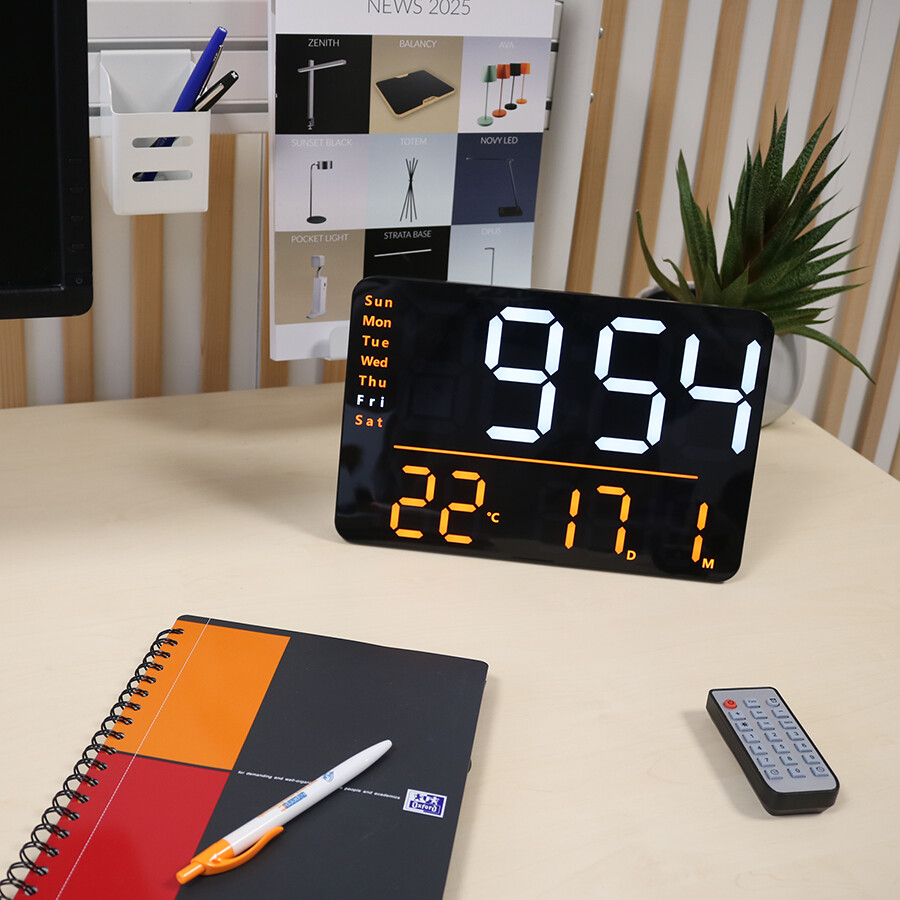 - nowoczesny zegar z podświetlanym wyświetlaczem, który pokazuje godzinę, datę i temperaturę