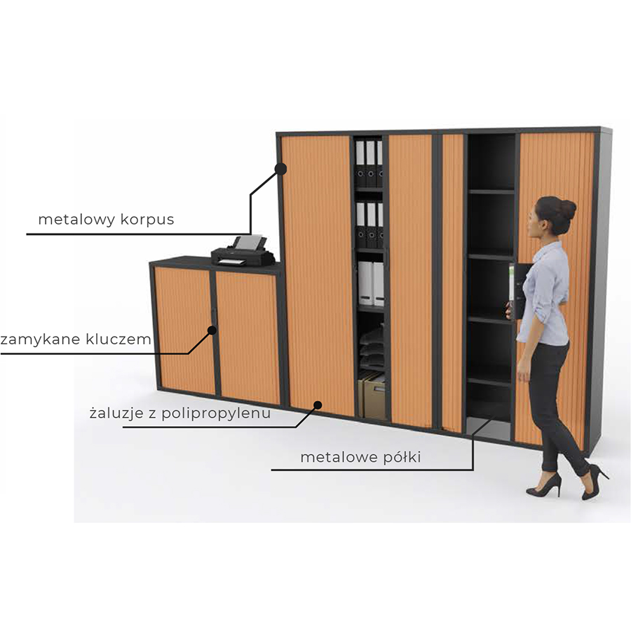 - półki metalowe z regulacją wysokości (pod półką można zawiesić teczki)